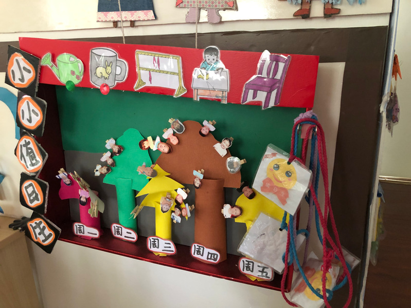 班级门口值日生的分配,一棵小树代表一天,上面夹着值日孩子的照片。
