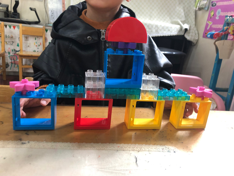 这是孩子们在玩积木的时候一个男孩子拼出来的“大桥”,我发现这个桥在结构上是对称的。这对小班孩子来说已经是很厉害的了。
