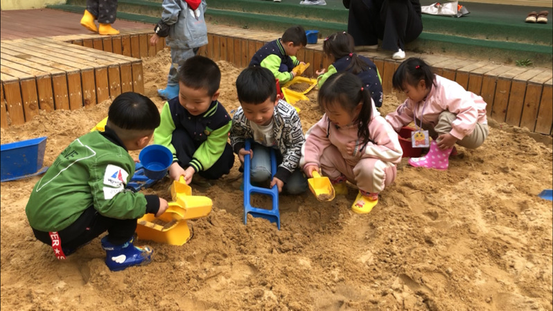 我发现他们的合作意识没有很强,会出现想法不同的情况。比如有的孩子说她在挖下水道,有的孩子又要在同一片地方盖房子。而且当时有一个男孩在大喊:“我们的施工地需要水!”但是几乎没有孩子理会,最后还是老师加入游戏,帮着说:我们这里的施工地需要水,谁来帮帮我们。才有孩子过来倒水。