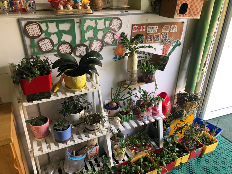 班级的植物角每个孩子都种了一颗小萝卜。有时早来的孩子会给植物浇浇水。