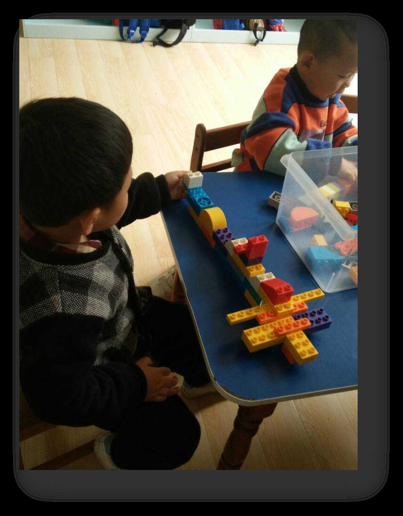 晨间活动,乐高的翻转声,孩子的讨论声及欢笑声,从小一班传出。陆续来到小一班的小朋友放下自己的小书包,搬起小板凳来到小桌子面前,开始玩起了乐高。
