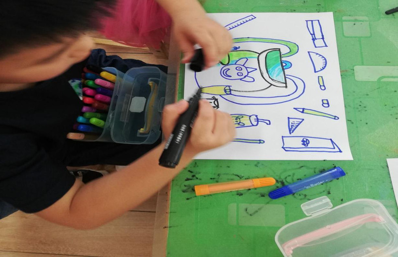 小希对画画很感兴趣,有的孩子在听到要画画的时候都不愿画,但是小希主动提出想要画画,并且很有想象力和创造力,在我以为他只画了一个书包的时候,他却画了很多文具,他说因为书包里装有文具,所以必须要画出来。在我的引导下,小希很细致的观察了铅笔、橡皮等文具,在掌握了他们的特征后画了出来,并且画了没有看见的。他问我刨笔刀是什么样子的,然后在我的描述下很生动的画出来了。因为兴趣,小希对画画很有创造力。在日常生活当中小希的观察力和专注力也很强。